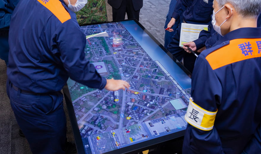 その他、模擬訓練として月1回ほど、実際に「ELMO DXテーブル」上の地 図に線を描いたりと、操作に慣れるための訓練を実施。日常業務の会議 でもシステムを積極的に活用し、本番で慌てずに使用できるように訓練を積み重ねている。
