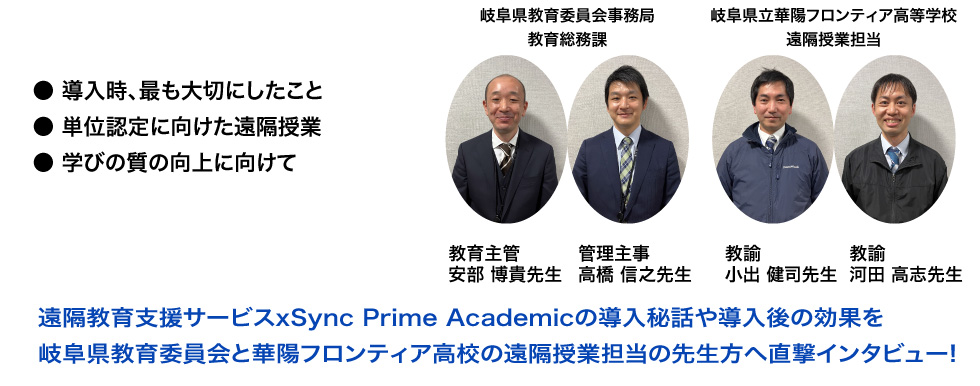 岐⾩県教育委員会では令和元年度に電⼦⿊板機能付きプロジェクターとホワイトボードをすべての県⽴⾼校と特別⽀援学校に常設整備しました。現在、県⽴⾼校の授業では、プロジェクターで投影した映像へ先⽣や⽣徒がホワイトボードマーカーやデジタルペンで書き込む授業スタイルが定着しているため、電⼦⿊板を通じて遠隔地間の双⽅向で書き込みができ、⽣徒の板書もリアルタイムで配信センターの先⽣へ共有できる「xSync Prime Academic」の機能が、対⾯授業から遠隔授業へ教育の質を継承できる決定打となり、「遠隔教育⽀援サービスxSync Prime Academic」を採⽤しました。これにより、岐⾩県初となる「単位認定を伴う遠隔授業」への取組がスタートしました。