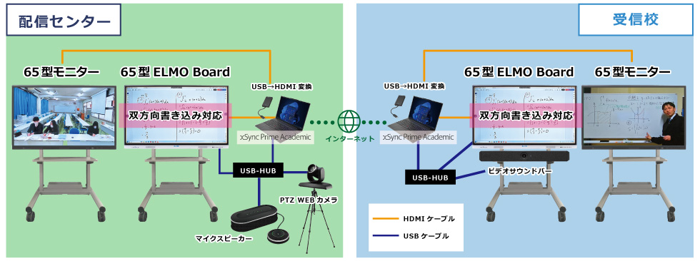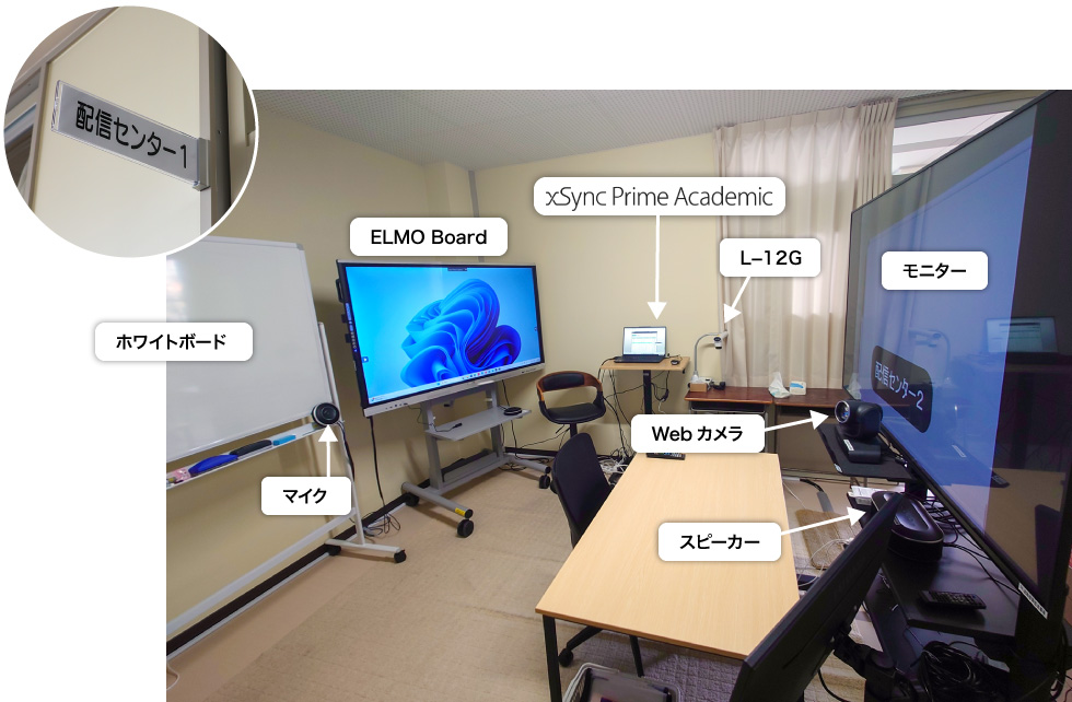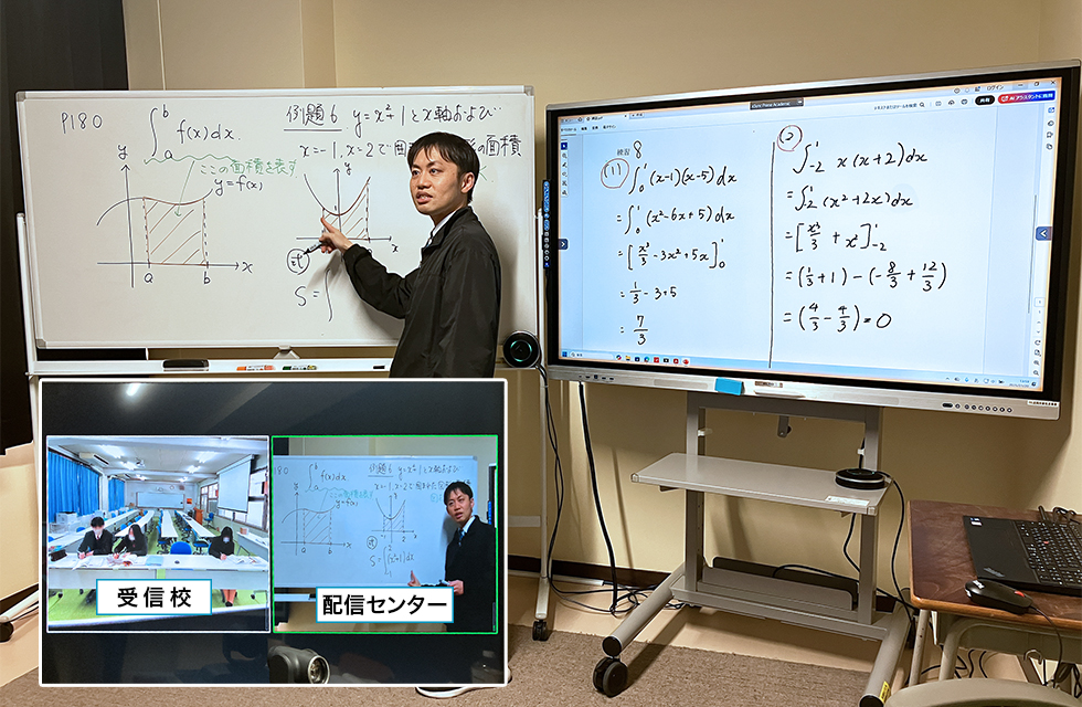 遠隔授業の配信センターは華陽フロンティア⾼等学校(通信制)内に設置し、数学と理科の2スタジオを設け、対⾯授業時と変わらない形で遠隔授業を受信校へ届けるために電⼦⿊板 ELMO Board とホワイトボードを並列に配置しています。