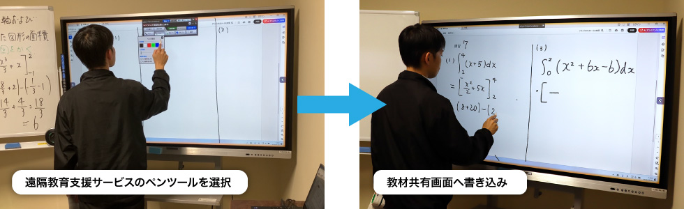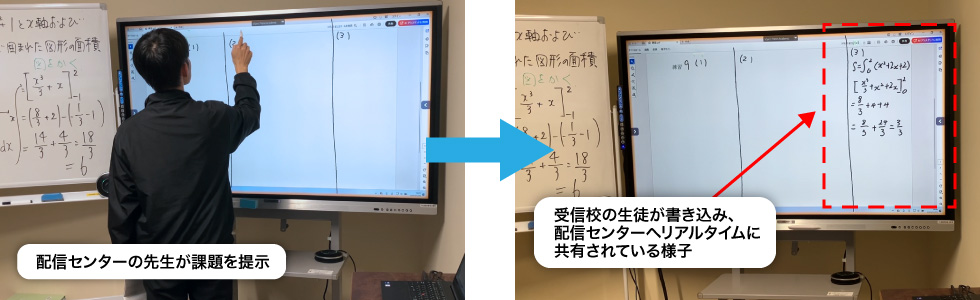 数学において重要な「解法プロセスの共有」には、電子黒板が大きな役割を果たしています。先生が一方的に解説するのではなく、画面上で生徒に数式やグラフを書いてもらい、それを先生がリアルタイムで確認・添削するコミュニケーションが行われています。例えば、その場ですぐに先生が丸をつけたり、生徒の書いた計算式に先生が修正を促したりできるため、対面授業と遜色ないスピード感で授業が進みます。