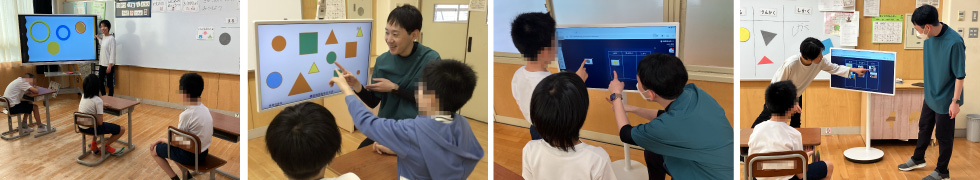 算数の「いろいろなかたち」の学習では、大きい電子黒板を使用し、全体(一斉)でそれぞれの形の特徴について、これまでの学習の振り返りをしました。その後、習熟度別に2グループに分かれてMOMOBoを使い学習を進めました。教室や身の回りにある「まる、さんかく、しかく」を探してタブレットで写真を撮り、ロイロノートを用いてMOMOBoに映しながら仲間分けをしました。最後に、MOMOBoを教室の前に移動させて、2台並べてお互いに撮った写真を見せ合い、交流しました。