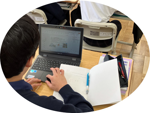 こうした“創造的な学び”をさらに⽀えるツールとして、同校では電⼦⿊板を導⼊を決めました。「⽣徒が⾃分の考えをタブレットで共有する中で、教員も柔軟に授業を展開できる環境を作りたい」という想いから、電⼦⿊板は、授業の“中⼼”ではなく、“⽣徒と教師、個々の考えをつなぐための場”として位置づけられています。開校当初からICT活⽤を重視していたことに加え、近隣市町でもICT整備が進み、転任してきた教員が電⼦⿊板に慣れていたことも導⼊の追い⾵となりました。