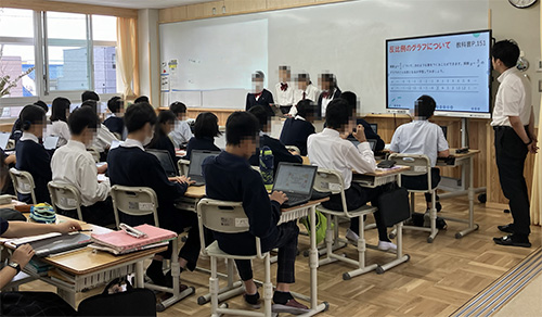 授業では、電⼦⿊板が「対話と発⾒のきっかけ」として活躍しています。数学では、グラフや図形を描いて即座に保存・再利⽤できる点が評価されており、「授業の記録を残して次の時間に⽴ち戻る」「思考の過程を⾊分けして⽐較する」など、“考え⽅の⾒える化”に役⽴っています。その他の教科では、⽣徒が⾃らスライドを作成し、仲間と発表・議論を⾏う授業が増加。「⾃分たちで学びをつくる⾯⽩さを感じる⽣徒が増えた」と先⽣達で話しています。