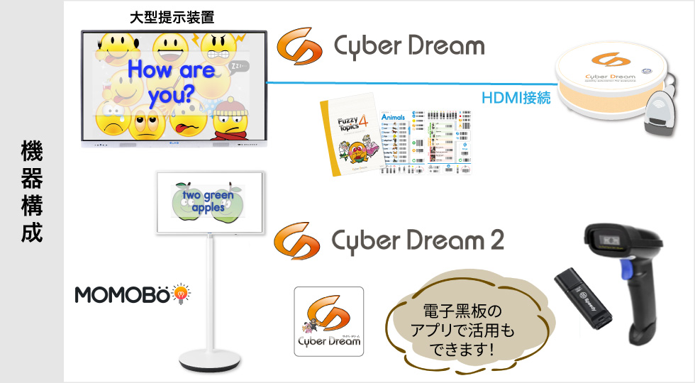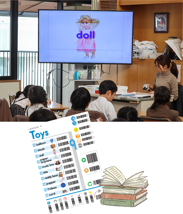 その実現に向けて導⼊されたのが、映像と⾳声で授業を⼒強くサポートするICT 教材「サイバードリーム」です。テキストのバーコードを読み取るだけで必要な映像・⾳声が即座に再⽣されます。トピックもその場で⾃由に選べるため、児童の反応に合わせて対応でき、ライブ感のある授業が展開できます。操作は⾮常にシンプルで、初めて利⽤する教員でも直感的に扱えます。誰でもすぐに授業に取り⼊れられる点が⼤きな魅⼒となり、採⽤の決め⼿となりました。