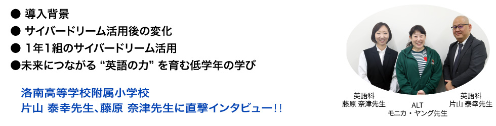 ⼩学校での英語教育が本格化する中、洛南⾼等学校附属⼩学校では「学校全体で英語教育を提供する体制づくり」を⽬指し、⽇々取り組みを進めてきました。教員それぞれの経験を活かして、誰もが安⼼して質の⾼い英語の授業を実践できる環境を整えることを⽬指しました。
