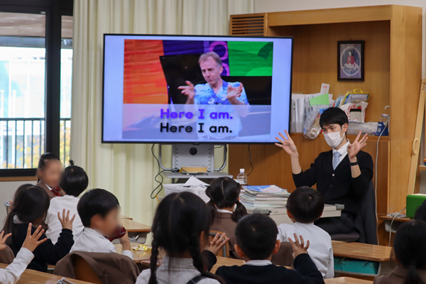 1・2年⽣の教室では、児童が⽴ち上がり、体を動かしながらのびのびと発⾳する姿が⾒られます。⾳やリズムを柔軟に吸収する低学年ならではの特性が⽣かされ、⾃然に発⾳が良くなっていきます。学習を重ねるにつれて⾃信が育ち、積極的に⼤きな声で英語を話す児童が増えてきました。