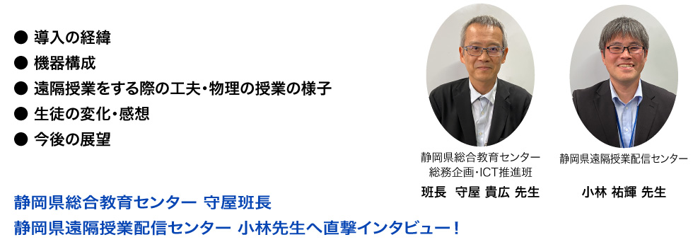 静岡県では、特に中山間地域において高校の小規模化が進んでいます。これに伴い、特定の科目を専門とする教員が配置できず、「物理を学ぶ機会を設けたいが、校内に専門の教員がいないため授業が行えない」といったことが課題となっていました。この課題を解決するため、専門教員がいる拠点から遠隔で授業を配信し、どの学校にいても生徒が希望する科目を履修できる体制を構築することを目指しました。令和7年4月に静岡県総合教育センターに「遠隔授業配信センター」を開設し、学びの機会の充実を図っています。現在は松崎高校、伊豆総合高校土肥分校、浜名湖北高校佐久間分校の3校に対し物理の遠隔授業を配信しています。