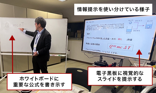 遠隔授業をする際の工夫として、電子黒板とホワイトボードを併用しています。電子黒板で視覚的なスライド資料を提示し、アニメーションや図解を用いて直感的な理解を促しています。スライドはクリック一つで解答を表示させることで授業のテンポを維持しています。ホワイトボードには細かい式展開や、授業の最後まで残しておきたい重要な情報を書き残しており、2つの画面で情報の使い分けを行っています。