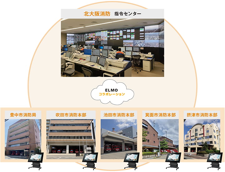 大阪府豊中市、吹田市、池田市、箕面市および摂津市は、複雑多様化する災害に備え広域的な対応力の強化を図るため、令和6年(2024年)4月より北大阪消防指令センターの共同運用を開始した。 規模の拡大に伴い、指令管制・現場活動をサポートするシステムの1つとして「ELMO緊急対策ソリューション」を採用。5市の豊中市消防局・吹田市消防本部・池田市消防本部・箕面市消防本部・摂津市消防本部には電子作戦テーブル「ELMO DXテーブル」を配備した。北大阪消防指令センターと各消防局・消防本部および現場とはリアルタイム情報共有システム「ELMO コラボレーション」により情報共有体制を構築。災害時における円滑な情報共有により、さらに迅速で的確な消防・救急・救助活動を行う。