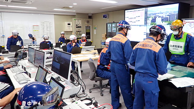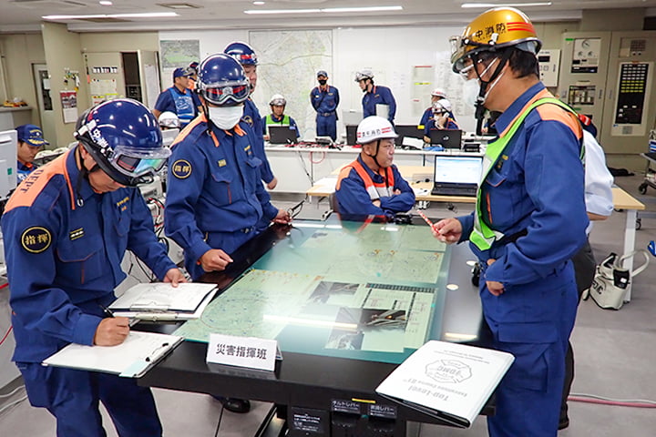 大規模災害時に災害対応の中心となる各市の警防本部が設置される作戦室に「ELMO DXテーブル」を設置。北大阪消防指令センターおよび現場のタブレット端末と「ELMO コラボレーション」で繋ぎ、情報共有ツールとして使用している。