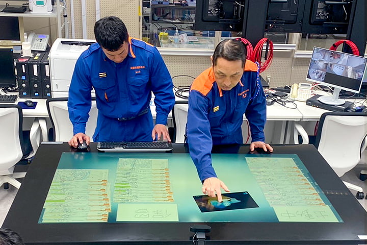 ディスプレイは65インチの大画面なので、複数人で同じ情報を見ながら検討が可能。情報をデジタルで一元管理することにより共有・更新がスムーズになり対応の迅速化に繋がっている。