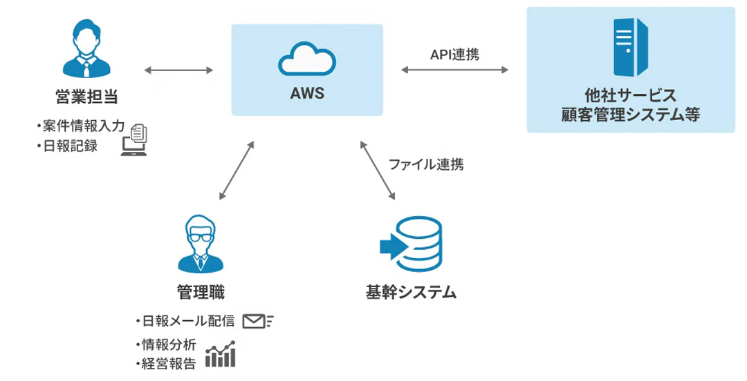 案件毎の注文内容/商談状況/問い合わせ対応などの情報を一元管理し、外部サービス(請求書管理/名刺管理)との連携も行える案件管理システムを開発しました。