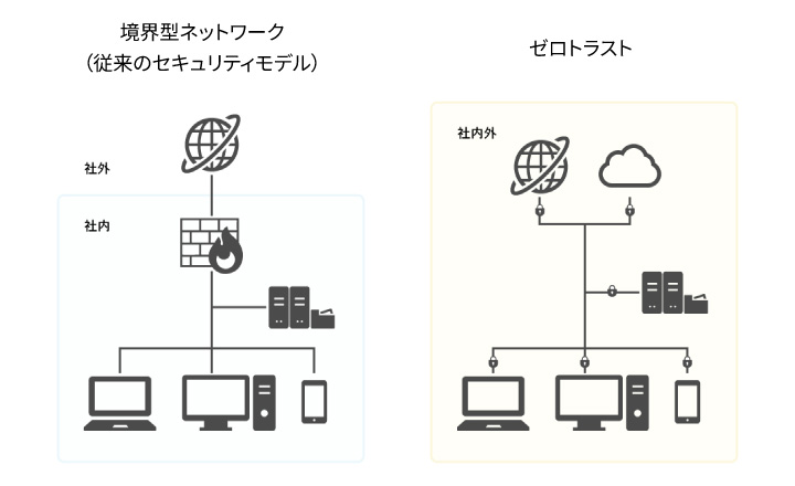 従来のセキュリティモデルは、ファイアウォールを境界として「内側は安全・外側は危険」と考える境界型ネットワークでした。安全な職場内(内側)をデータの保管場所や働く場所としてきましたが、テレワークやクラウドの活用が進み、境界を設けて防ぐのが難しくなってきたというのが現状です。