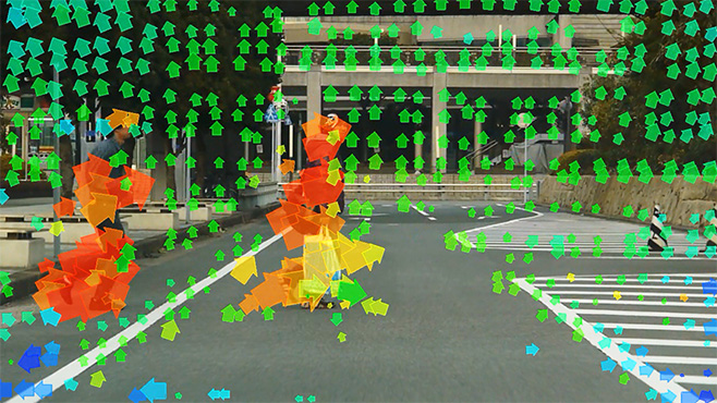 上下左右に激しい動きが生じる車載カメラの映像のブレを抑制する画像一致点検出技術の応用例です。左右へのロールや大きな振動に対しても違和感の少ない補正が可能です。