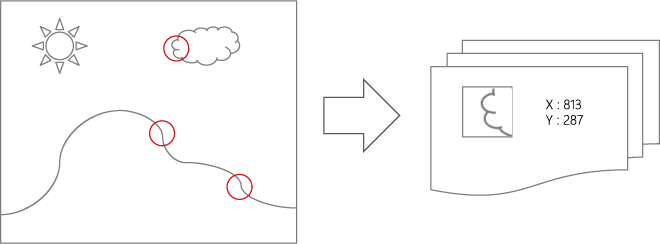 あらかじめ学習しておいたパターンが画面上に現れた時、または対象物が動いたり状態が変化したりした場合に、その物体を検出する画像一致点検出技術の応用例です。