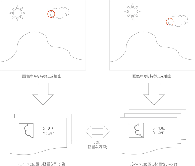 本技術は、特徴点検出技術によってビットマップ画像中から特徴的なパターンを正確かつ高速に抽出し、その特徴点データ(数値と座標を組みとした一列の軽量なデータ)を複数の画像間で比較することで一致点を検出する技術です。 画像から求めた特徴点データのみを比較するので、演算量が膨大になる複数の画素値同士を直接比較する差分絶対値和(SAD:Sum of Absolute Differences)などと比べ、圧倒的に少ない演算量で画像の一致点を検出することができます。