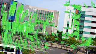 歩行しながらの撮影で発生する振動を抑制する画像一致点検出技術の応用例です。この手ブレ抑制は画像から得られる特徴点検出の情報のみを使って実現できるため、ハードウェアの情報に依存することなく実現することが可能です。