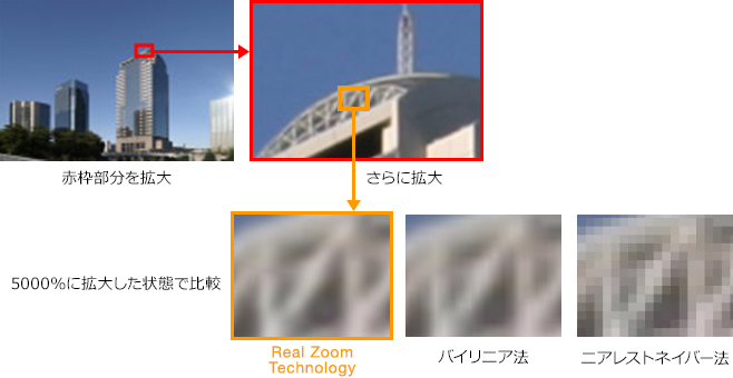 本技術は、画像構成点の間を滑らかな曲線で補間する演算手法を用いることで、拡大率に依存しない高品位な画素補間を提供します(Real Zoom Technology [リアルズームテクノロジー])。