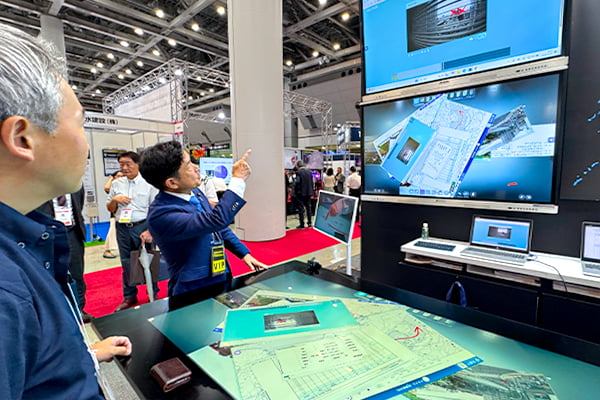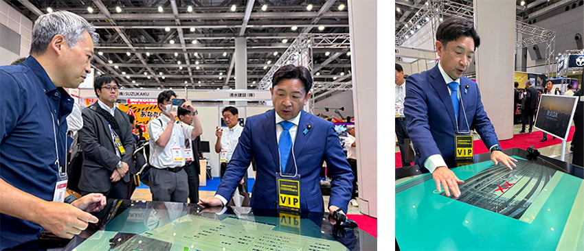会期初日の1日には、瀬戸隆一内閣府副大臣が視察のため当社ブースへ来訪されました。当社より、自治体・企業における緊急時の情報共有オペレーションを強化する「ELMO緊急対策ソリューション」をご紹介しました。瀬戸副大臣には災害時の情報集約を迅速化させるシステムの操作感について強い興味を示していただきました。