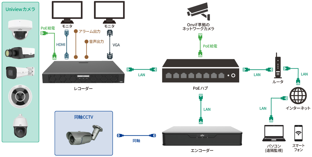 HUBを使用することで複数台のカメラをLANケーブル1本で伝送できます。1本のLANケーブルで映像伝送と同時に電源供給が可能なカメラが多く、配線工事も比較的容易です。設置場所の選択肢も広がります。